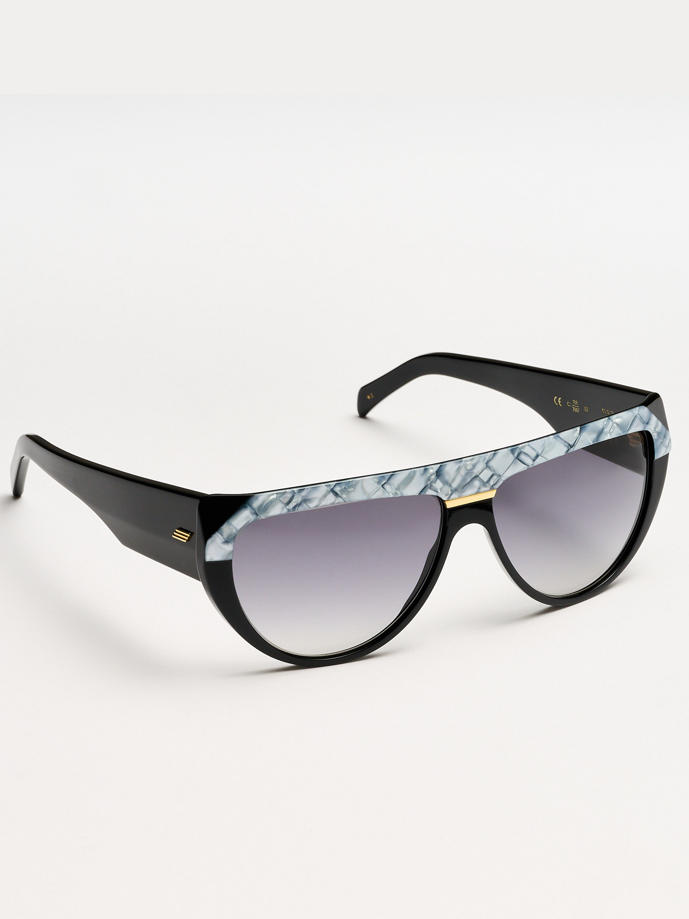 Le forme giocano con volumi scolpiti e contrasti decisi, modellati in acetati preziosi e arricchiti da un elemento gioiello incastonato sul ponte — un dettaglio che cattura la luce e l’attenzione.