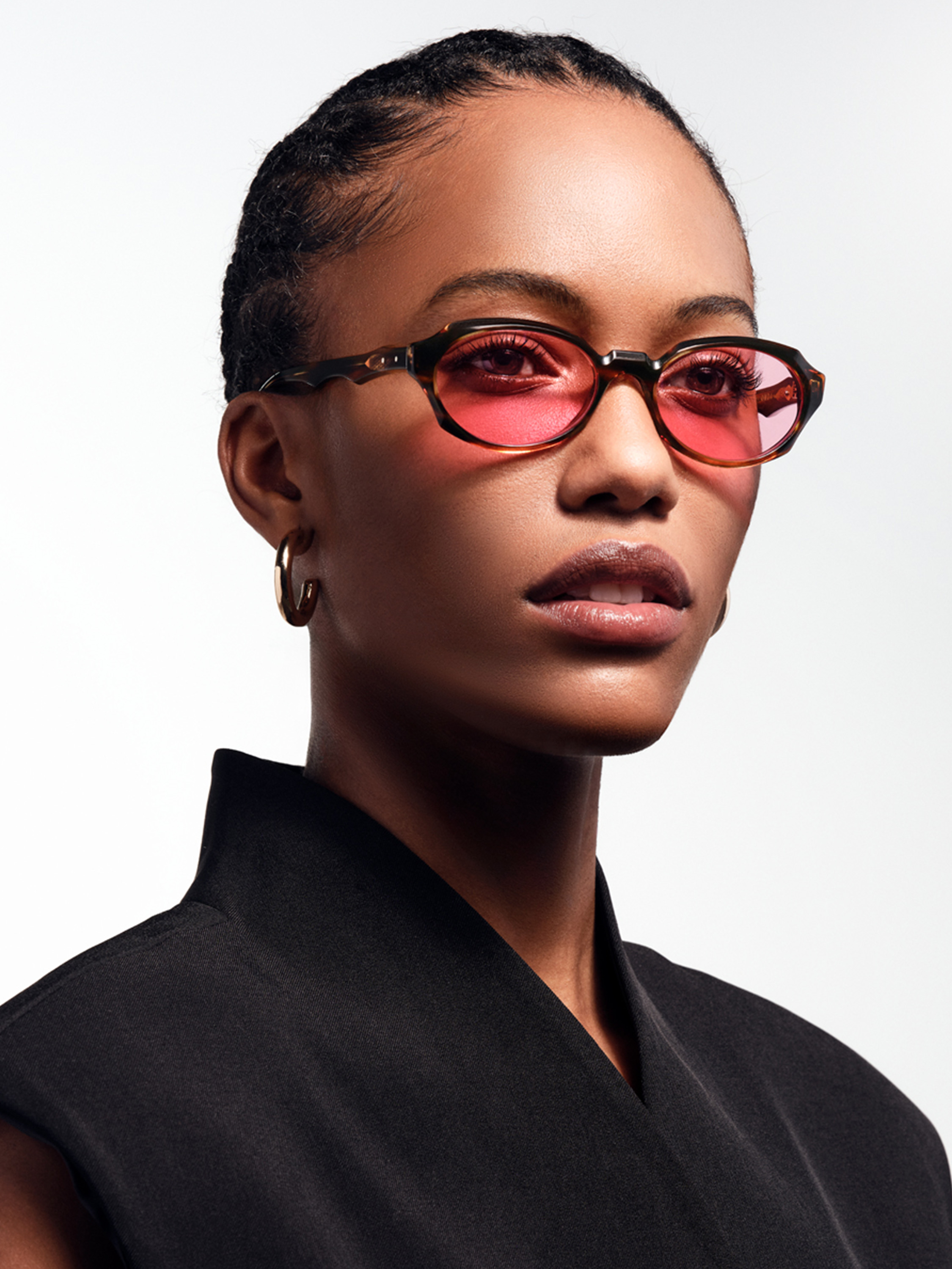 Frontale ovale compatto, cerniere affogate sul frontale, aste rivettate con sagomature ondulate, design elegante e creativo