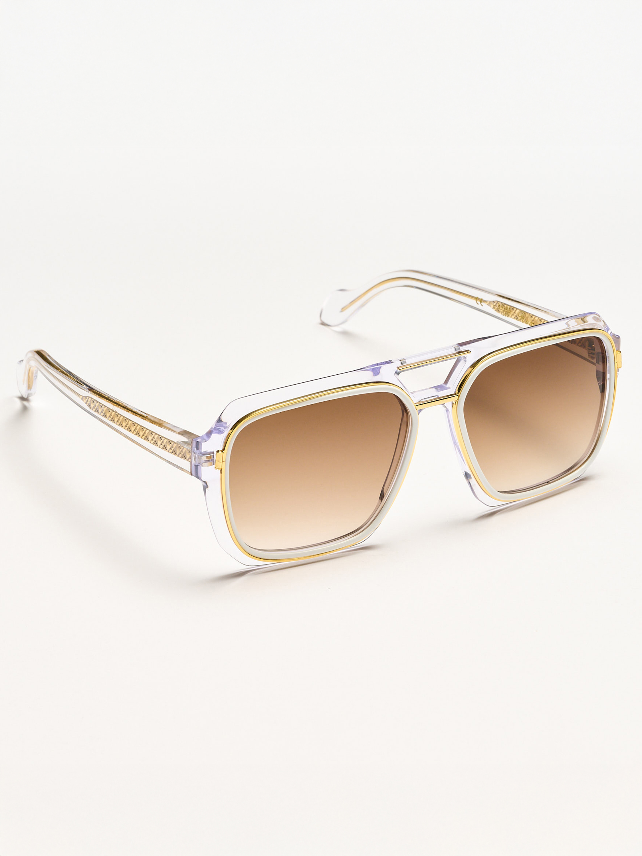 Roxanne è un occhiale da sole dal design deciso, realizzato interamente in acetato di alta qualità. La montatura, dalla forma squadrata e dalle linee marcate, è valorizzata da un doppio ponte che ne esalta lo stile grintoso. Un dettaglio distintivo è l’inserto metallico dorato che segue il profilo interno del frontale, creando un raffinato effetto di “occhiale dentro l’occhiale” che dona profondità e carattere. Infine, le aste, completate da un’anima metallica dorata e finemente incisa, aggiungono un tocco di eleganza ricercata.